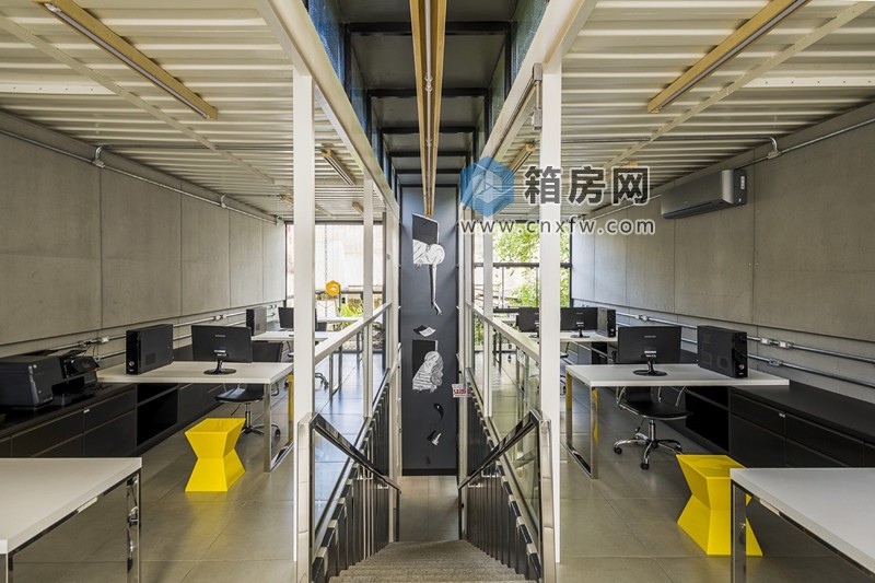二層是開放式的辦公區域,白色的辦公桌擺放在兩側的集裝箱,光線透過大量的玻璃窗戶照射進來,寬敞明亮,工作起來也更有精神了。