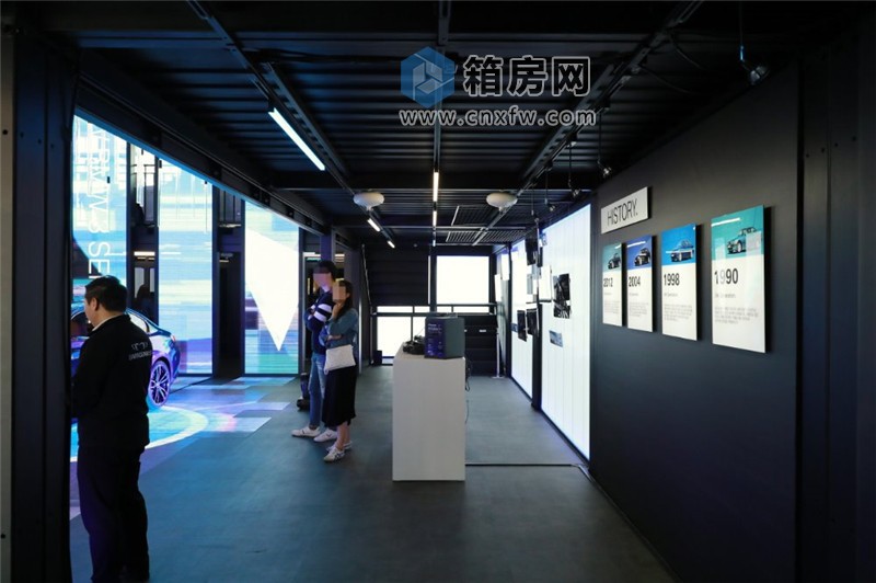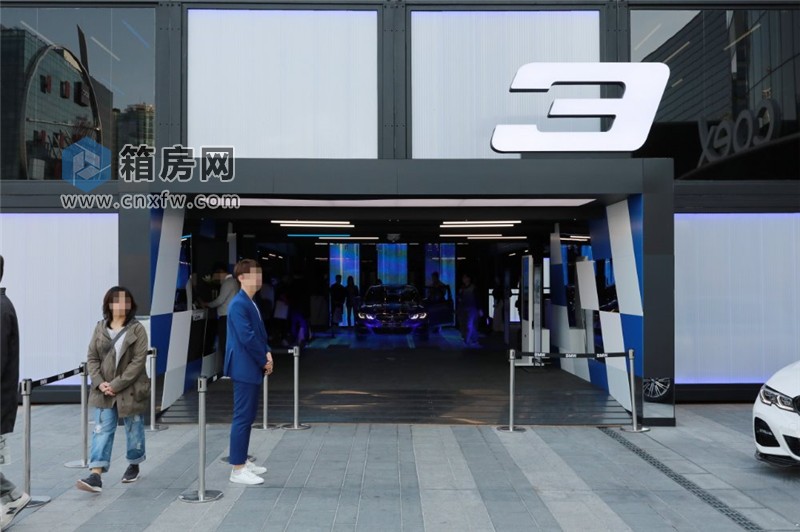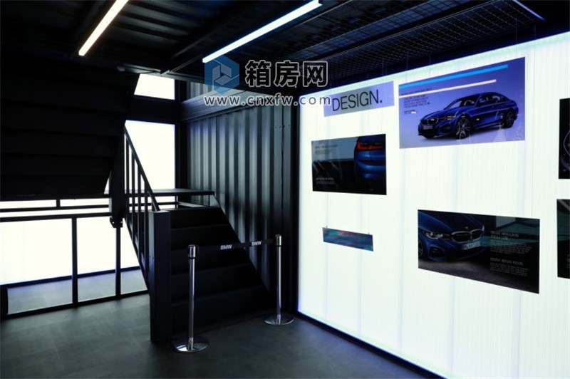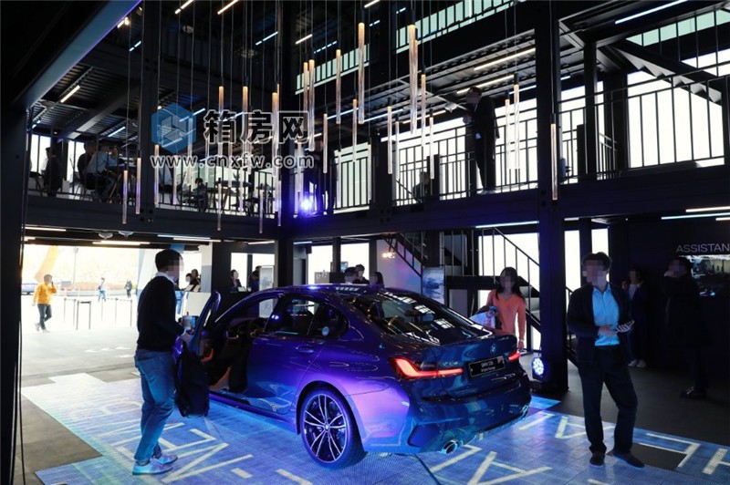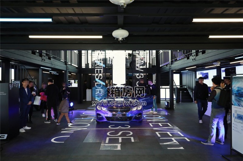 和許多極具科技感的展廳一樣,這座寶馬的展廳也是用了全黑的建筑背景,將室內(nèi)的燈光效果和車身突顯出來。因此,你會發(fā)現(xiàn)現(xiàn)場的燈都是以線條形狀為主,和集裝箱線條感十足的設(shè)定吻合。當(dāng)然,也會有一些整面發(fā)光的宣傳墻用以宣傳展示。