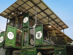 軍綠色咖啡小館,J’COFFEE樓高三層,由多個集裝箱搭建造而成。從下而上,每層集裝箱數量減少,呈現金字塔式造型,個性凸顯,配合綠植環境,打造軍綠森林風格。[查看詳情]