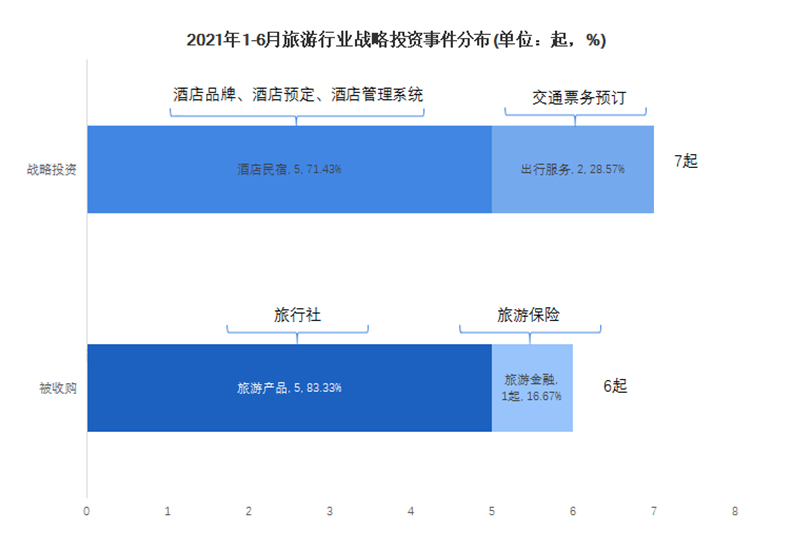 2021年上半年旅游行業投融資事件共發生67起,事件發生地較為分散,廣東和上海地區稍多;旅游行業細分領域中,酒店民宿、旅游產品和出行服務為投資熱門領域;在旅游行業中,最多的投融資事件為收購事件和戰略投資事件,其中,戰略投資事件所屬的細分領域為酒店民宿和出行服務這兩大熱門行業。2021年上半年我國旅游行業共發生31起投融資事件,1月和6月發生較多投融資事件,分別發生7起和8起。