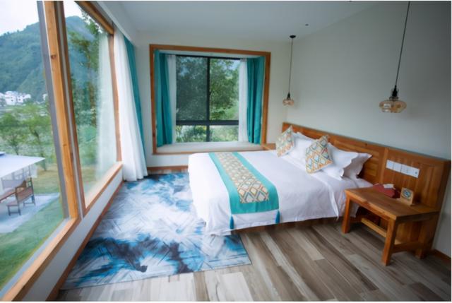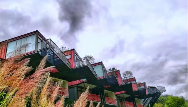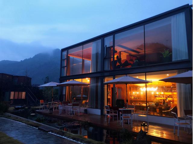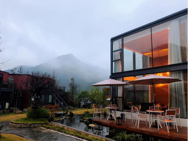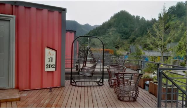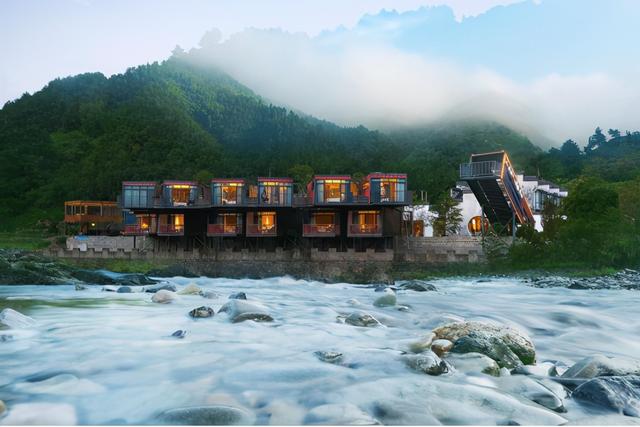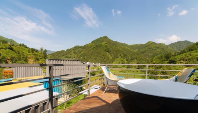 獨特集裝箱建筑坐落于美妙的山水之間,房間露天陽臺正對著外面的大山和流水,晚上能聽到靜靜地流水聲,落地大窗戶,躺在床上就能看到遠處的風(fēng)景。
