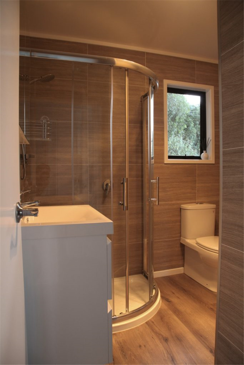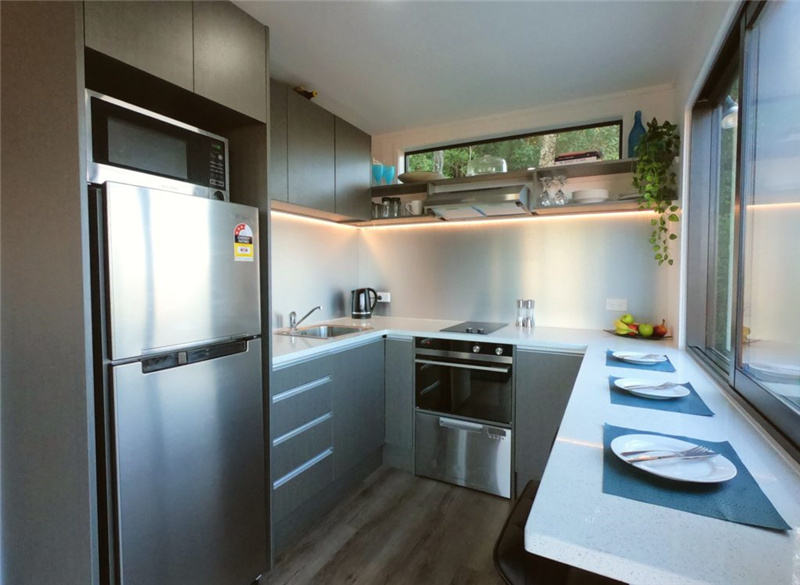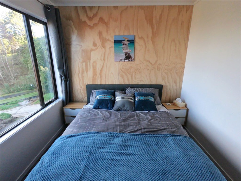 主臥室和起居區(qū)的寬度為1.5個容器,比單寬度模型具有更多的空間。除了主臥室,房屋內還有一個空置的次臥。為了增加防潮效果,衛(wèi)浴間的墻面和地板都貼上了瓷磚,整體空間比較小巧。