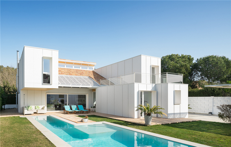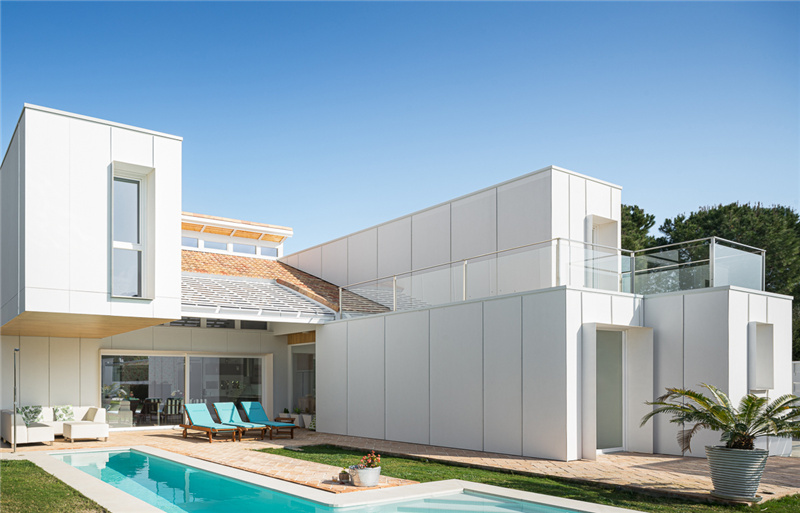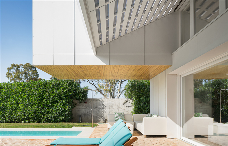延伸到游泳池上方的容器創(chuàng)建了一個舒適的門廊,利用遮陽板將其與北面的建筑物相連起來,可以將客廳放置中部的空間里。第一眼看到該集裝箱房屋的白色涂料外觀,就會有一種平和的感覺。與傳統(tǒng)的容器式建筑相比,這種一以貫之的設計讓房子看起來更現(xiàn)代。