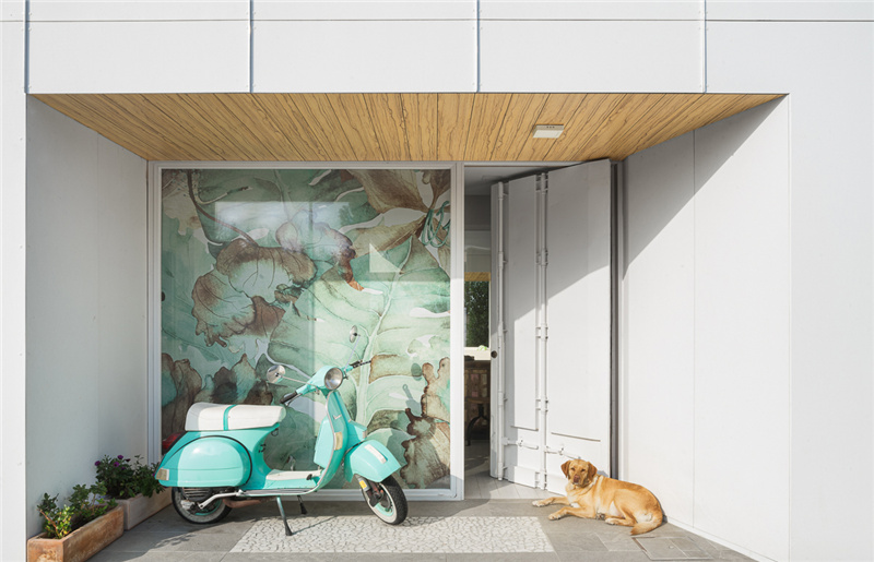 集裝箱的整個金屬板被切割,兩個翻轉形成了一個夾層,另一個五米的集裝箱延伸到房屋前方,并利用固定門的設計支撐整個夾層。作為第一視角,第一個兩層的體量幾乎覆蓋了整個建筑的表面,在穿過房門后起到了屏障的作用,同時也實現(xiàn)了更連通的活動空間。