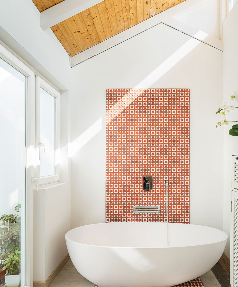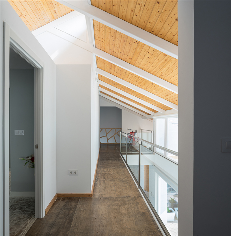 屋內采用復式結構,使空間看起來更為寬敞。房屋的屋頂以木板覆蓋,實現(xiàn)室內保溫的作用。其中,恰到好處的落差創(chuàng)造了一個透光的天窗,為該樓層的臥室和衛(wèi)浴間打造了明亮且舒適的居住環(huán)境。
