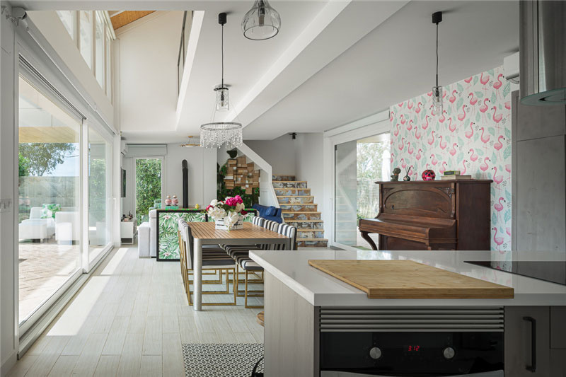 屋外優(yōu)美的景色通過大面積的落地玻璃窗透進屋內,即使身處室內也能為寧靜的美景著迷。房屋內部布置了簡單的細節(jié),開放式的廚房和就餐區(qū)為生活預留了更多的活動空間,把全景玻璃門推開便可以連通戶外的泳池。