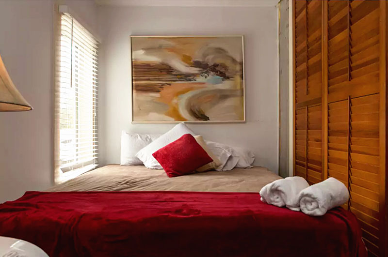 一樓主臥光線透過床邊的窗戶照射進來,床頭墻壁掛上藝術畫作,非常舒適。主臥隔壁的雙層坐床房,下層即可用作椅子也可做床使用,上層還有一張獨立小床,竹簾的窗戶裝飾非常別致。