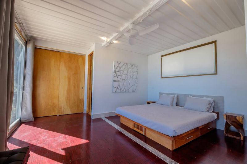 一個衣柜相隔的背面是臥室空間,一室公寓式的臥室配有一張特大號的床,可以看到房屋的地板是保留了鉚釘和其他一些原始的集裝箱材料。私人浴室位于臥室的旁邊,配有混凝土洗手臺和一個寬敞的瓷磚站立式淋浴間。