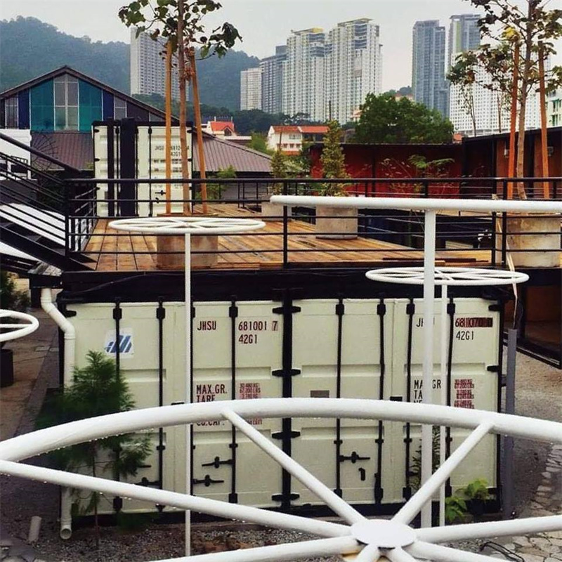 大部分的集裝箱都被改造成一個獨立的一層半建筑,底下是集裝箱圍成的室內(nèi)環(huán)境,樓上則是一個天然而成的露天平臺,鋪上地板圍上欄桿便是一個不錯的休閑之地。而它們的旁邊都架有簡易的上樓鐵梯,底下又能藏一些小植物。