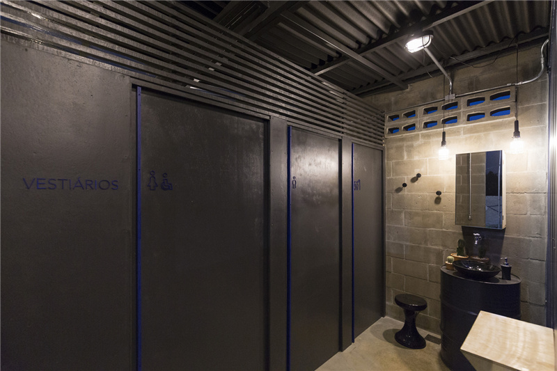 進入更衣室,依然是裸露的電氣裝置,但全黑的色調更加凸顯了工業屬性。這里是唯一建造的產生最少廢物的房間,由結構混凝土砌塊制成,為了保證自然通風,還在靠近頂部的位置進行了留空。