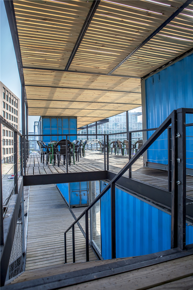 整體上,以集裝箱為主體,鋼結構的框架可以作用在11個抗震結構上。獨特的建筑風格,通過一系列的設計,縱向容納不同的室內和陽臺。