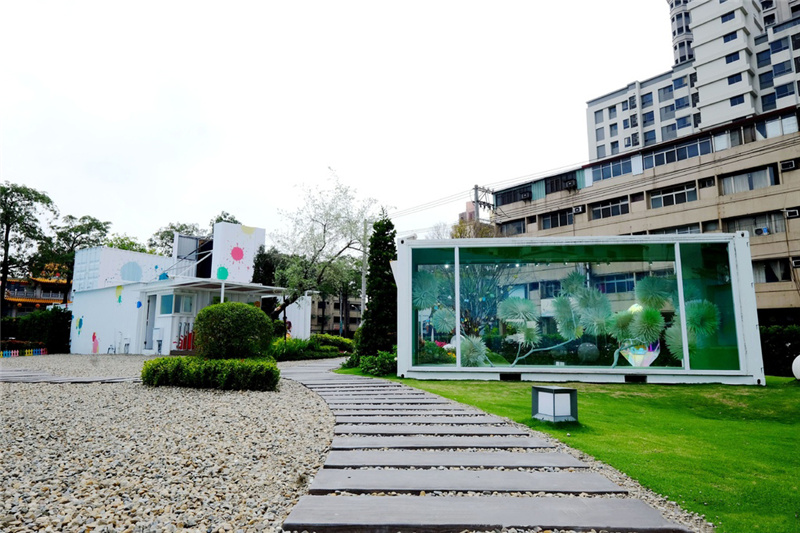 園區(qū)內(nèi)有一座座集裝箱房打造成有趣的裝置藝術(shù),其中一座純白油漆潑痕點綴堆疊而成的集裝箱屋,是園區(qū)里面的“藝術(shù)駐村中心”,而服務(wù)臺也位于此處。