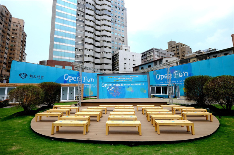 繼續(xù)往前走是一個色彩鮮艷的集裝箱和一堆鐵框,鐵框內(nèi)鑲嵌上一些反光的材料,將鋼鐵元素玩出無限可能。再過來是一個“鏡子箱”,它們的前方剛好圍成一個露天舞臺,用于舉辦各種不同的藝術(shù)活動,一個大草坪實在太適合戶外玩耍了。