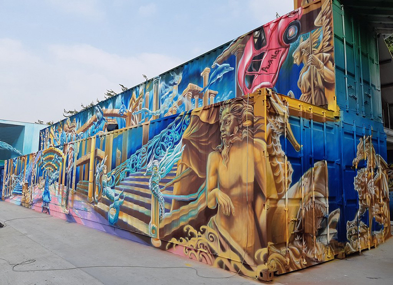 另一側的巨型集裝箱彩繪也是海洋世界,但呈現的是另一個主題,這個主題更加貼近自然生態的和諧統一,還有許多可愛的小動物躍然箱上。再過來是西方神話故事一樣的唯美人臉,巨型的畫作毫無斷層,銜接流暢,實屬創作不易。