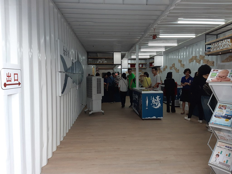 這個文創園名叫拾粹院,但其實它更傾向于一個鯖魚制品銷售點,從園區入口的玩偶到集裝箱內的掛飾、擺放的商品,都是鯖魚和其相關食制品,比如鯖粹精、鯖魚罐頭、鯖沙魚等等。游客在這里既能拍照打卡,也能購買到美味的食制品。