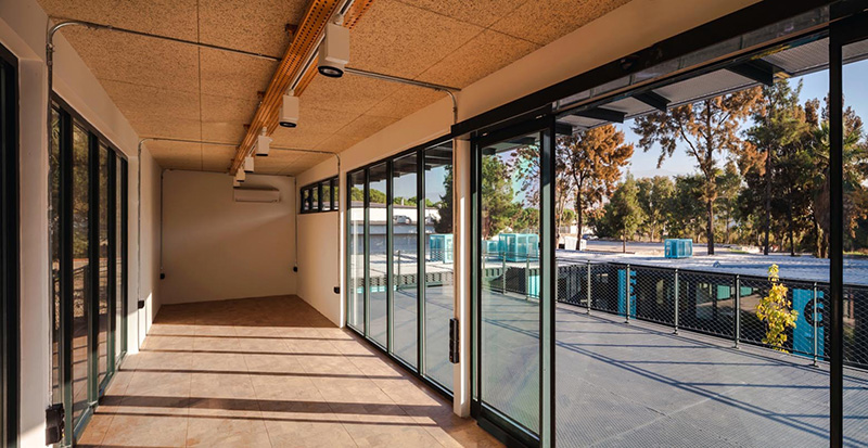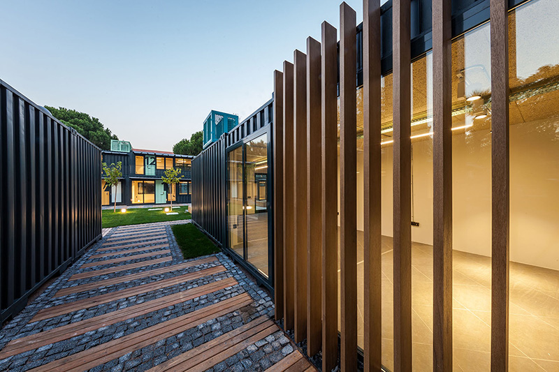 除了使用了大量的循環和再利用材料,該項目還展現了其范圍廣泛的生態策略。在集裝箱的擺放上,將較寬的一面南北向布置,狹窄面東西向布置,這樣可以使被動式太陽能和自然通風兩個生態策略發揮到最大化。利用現存的樹木作為最佳的遮陽設施可以讓陽光從南向窗戶灑進房間,另外,厚厚的絕緣設計,高效的空調、如軟木塞的自然材料的利用和LED照明系統都有利于將建筑對自然的影響降到最小。