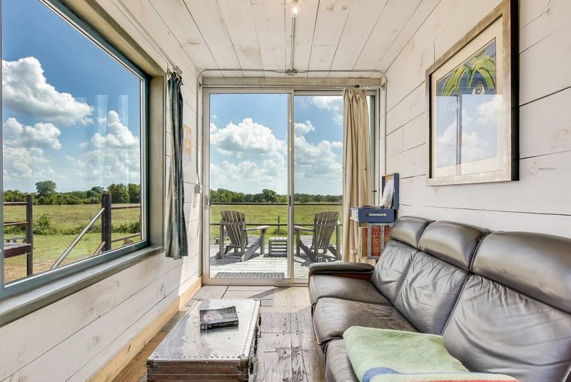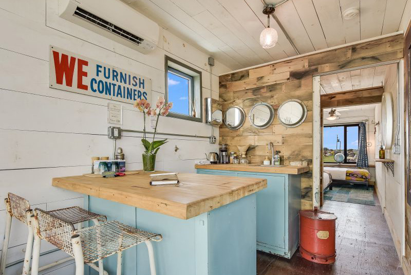 進(jìn)入集裝箱模塊內(nèi)部,這是一座帶起居室,沙發(fā),椅子,茶幾,天花板照明和深色硬木地板的現(xiàn)代住宅,極具復(fù)古韻味。這里沒有電視,但有一堆獨(dú)特的書籍,可以在閑暇時(shí)汲取精神糧食。廚房帶有微波爐,吊燈,冰箱,實(shí)木柜臺和落水槽,可以滿足基礎(chǔ)的烹飪需求。