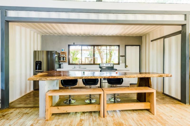 這座美麗的集裝箱房屋建設在4000平方米的土地上,房屋周圍環繞著一條60平方米(645平方英尺)的游廊,鋪設干爽的原木地板,放置簡易的餐桌椅,住戶可以在此放松身心,享受愉快的寧靜時光。