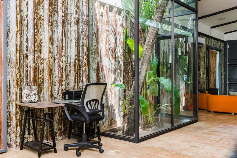 該集裝箱房屋的內部整體設計非常簡單,用來粉刷容器的顏色則十分獨特,用仿樹木紋路的柔和色彩是正確的選擇。此外,客廳內的一個亮點成為了整座房屋的“點睛之筆”——房屋原址的樹木得到了最好的保存,用景觀櫥窗圍起能得到親近自然的感官享受。