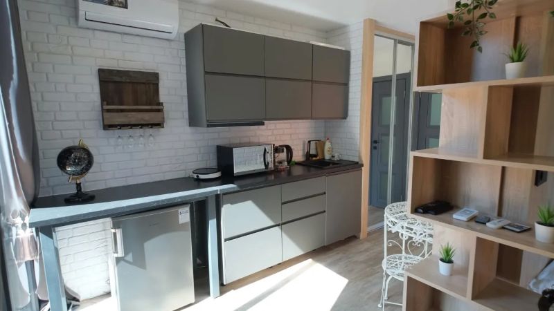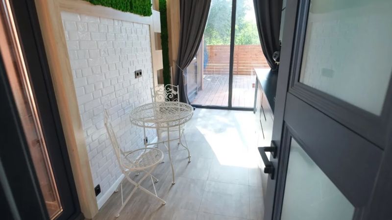 該房屋的總建筑面積為29平方米,居住面積則達到25平方米。入口處是一個開放式廚房,所有的櫥柜和家電都靠墻而設,可以基本滿足制作簡餐的需求。該空間還擁有可以直接通向戶外露臺的落地玻璃門,充足的陽光在此透射進來。