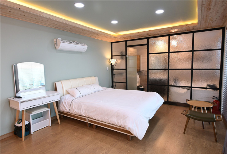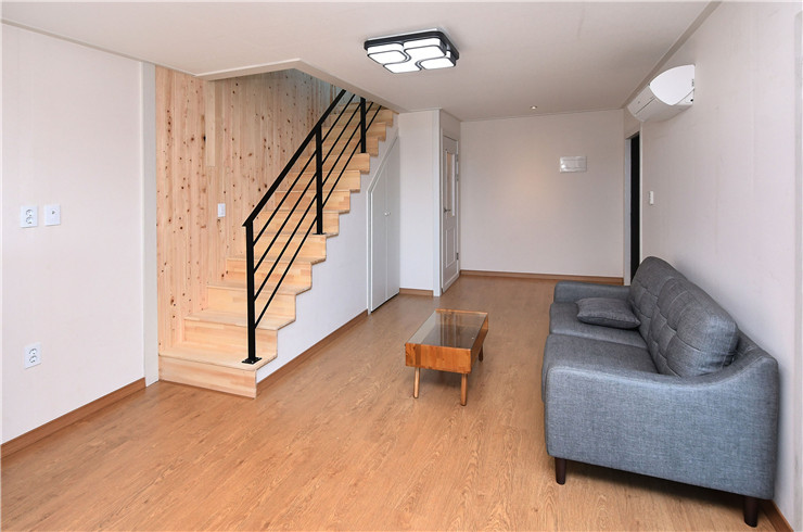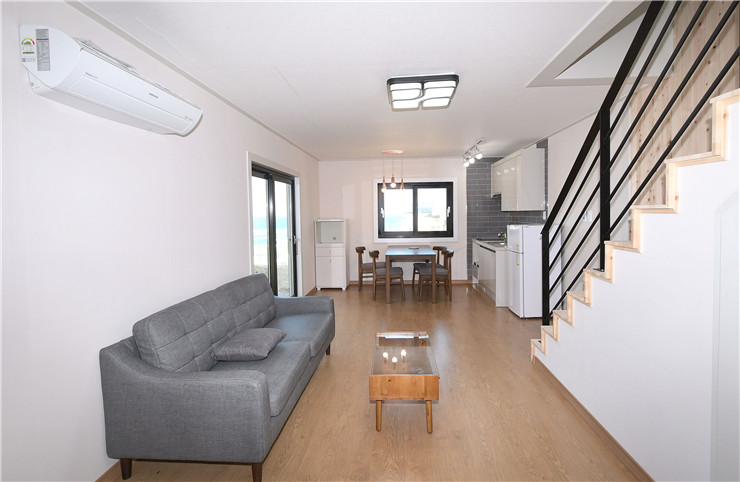 室內(nèi)設(shè)施,一樓是客廳和廚房,二樓是套間臥室和戶外平臺(tái)。墻體天花進(jìn)行了隔熱保溫處理,加寬的空間感十分舒適,環(huán)境簡單干凈。