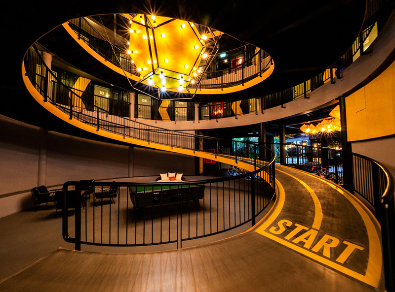 酒店內(nèi)的樓層與樓層之間通過回旋走廊連接,這是酒店的其中一大特色。沒有了熟悉的樓梯,取而代之的是趣味性的坡道,是不是看著就很想來體驗(yàn)一番?