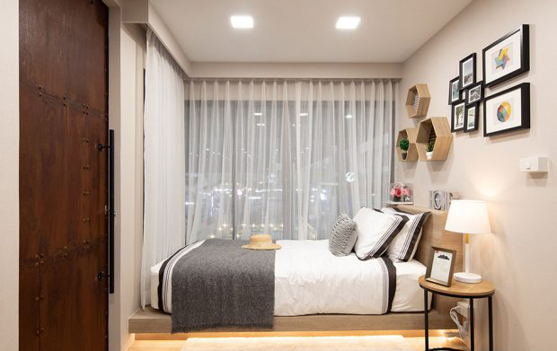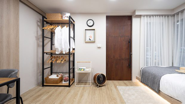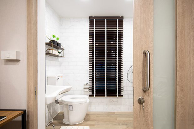 衛(wèi)浴間選擇安裝滑動(dòng)門以方便輪椅使用者,并通過精選的老年人專用潔具套裝以滿足特定人群的居住需求。樓上設(shè)有臥室、共用浴室和內(nèi)置家具。