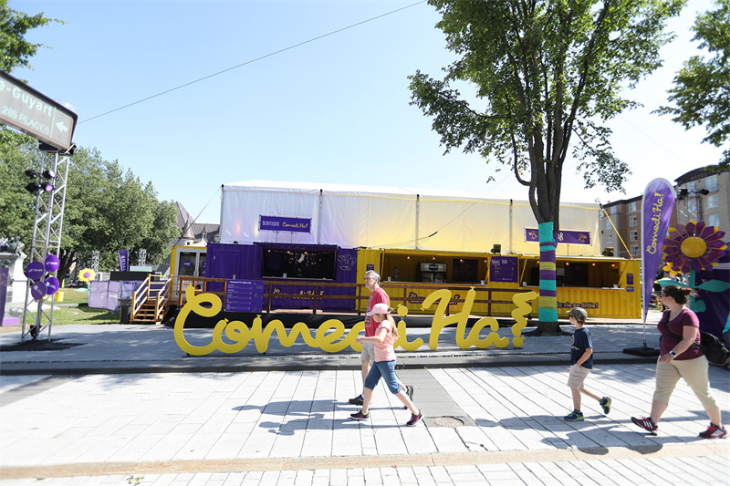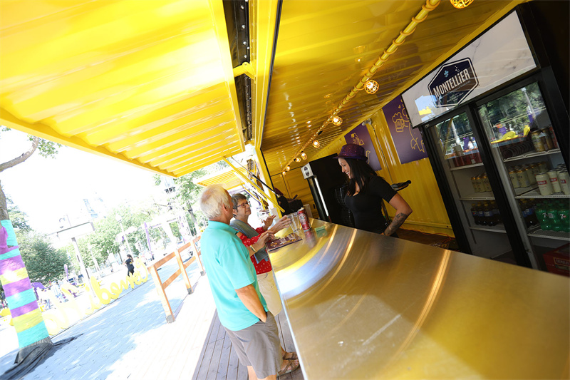 集裝箱被涂上了節(jié)日的專屬顏色——黃色和紫色交替出現(xiàn),門前豎有節(jié)日的雕塑牌。你會(huì)發(fā)現(xiàn)一些集裝箱被“挖”了一個(gè)售賣窗口,這其實(shí)是影院墻壁的多用。整體來(lái)看集裝箱是作為影院的一面圍墻,但細(xì)看它卻是一個(gè)個(gè)獨(dú)立的集裝箱商店。