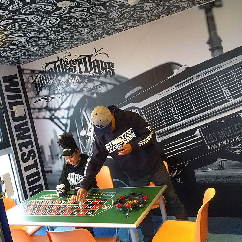 俱樂部的主題風格為狂野西部,是比較狂熱硬漢派的風格,整座建筑的外殼都被涂上了深藍色,讓取向更為男性化一些。現場還有許多老實汽車的海報,粘貼在復式大堂的箱壁和桌游室內。