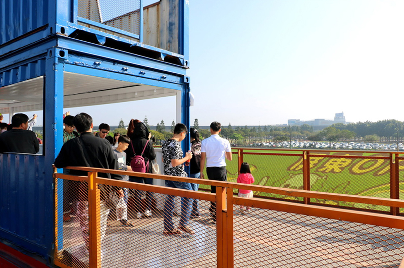 園區(qū)很大,因此也不止一座看臺。繼續(xù)往里走就會看到第二座集裝箱看臺。這是農(nóng)博必去的打卡點(diǎn)之一——彩繪稻田,從建筑的一端斜著往上進(jìn)入,可以看到沿途的景色,到達(dá)最高處就可以看到完整的彩繪稻田地景藝術(shù),是一片以多色系彩稻打造的超人氣明星作品。