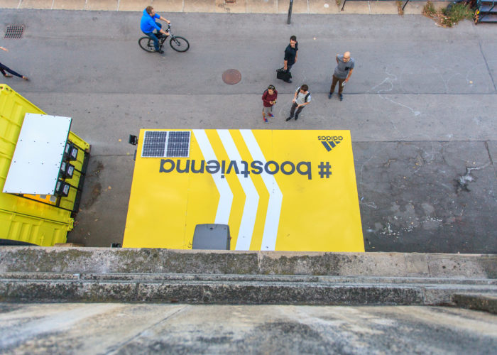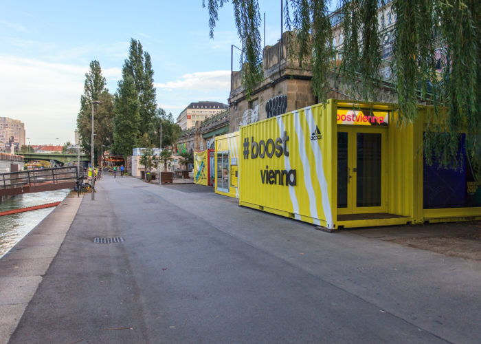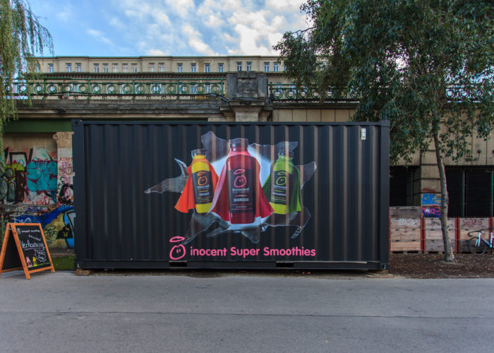 但箱身卻是不同尋常的“涂鴉板”,繪畫著品牌的飲料宣傳畫,就像是在箱壁上打洞鉆出來的動畫。不得不說集裝箱的形狀真的特別適合這種富有創(chuàng)意的涂鴉。