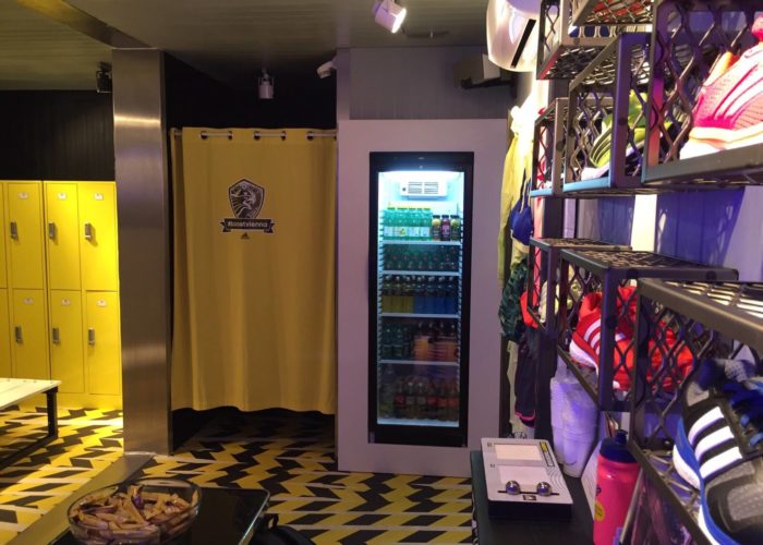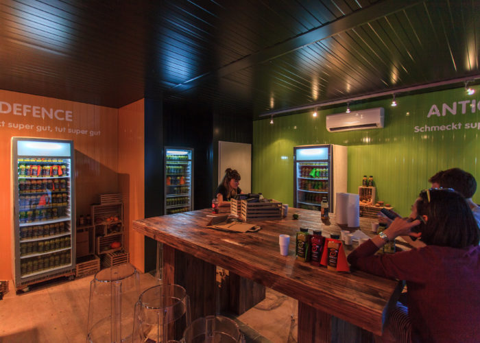而室內(nèi)則同樣是“看得見摸得著”的金屬制品,箱壁上富有質(zhì)感的紋路,中間一張大桌子可供聚會,四壁都有放滿飲料的冰箱。為了提供宜人的室內(nèi)溫度,空調(diào)必不可少。