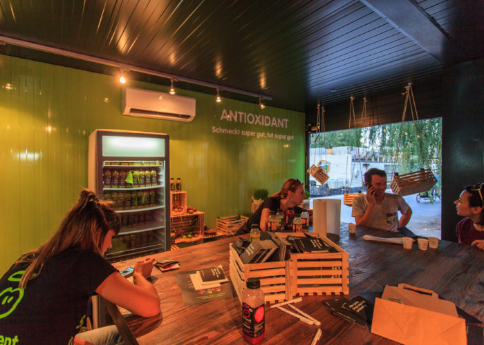 室內(nèi)是琳瑯滿目的商品,或整齊或隨意的擺放都彰顯了特色。箱壁就是展現(xiàn)商品最好而又最便利的展架,仔細(xì)觀察還會發(fā)現(xiàn)地上用以裝飾的“警示線”,具有特立獨行的風(fēng)格特色。