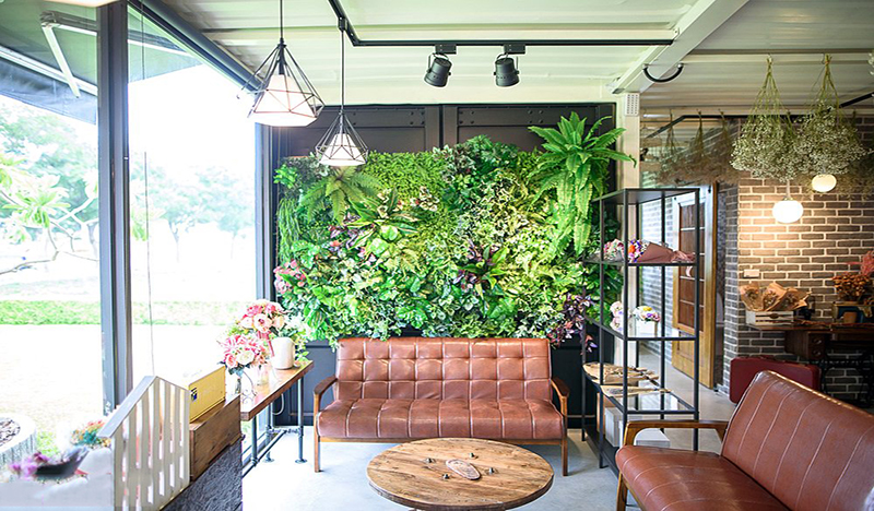 這座手作花坊主要的建筑分為一個紅色的集裝箱和一個黑色的集裝箱,沿著庭院里的小路往里走,從兩箱的交接處進入。黑色的這個集裝箱主要是作為下午茶店使用,箱壁和箱頂都經過精心的設計,箱頂懸掛著不同種類的干花束,營造出滿店都是花的浪漫環境。
