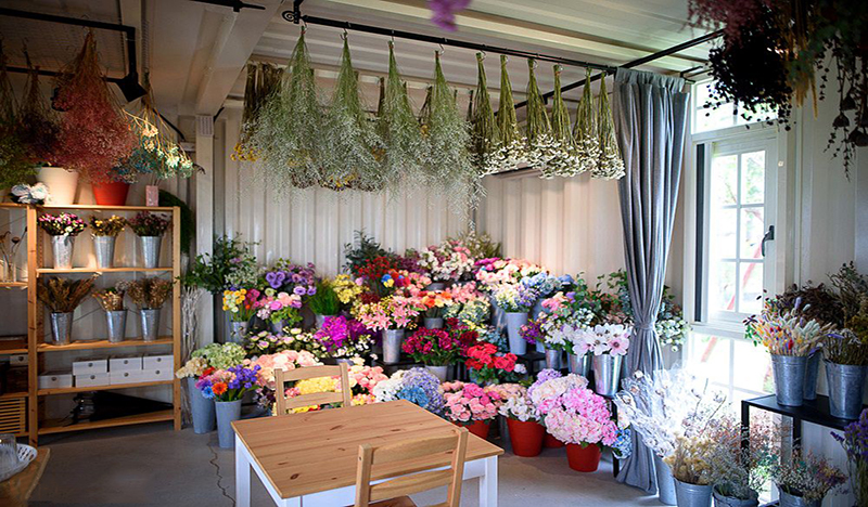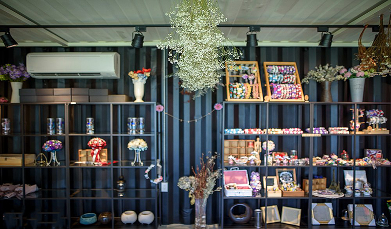 這是一家手作花坊,作為一座特色的集裝箱建筑,這里最大的優勢就是門前一個寬敞的庭院。鮮艷的色彩搭配突顯了環境的清新文藝,光是往院中一站就是網紅打卡點。