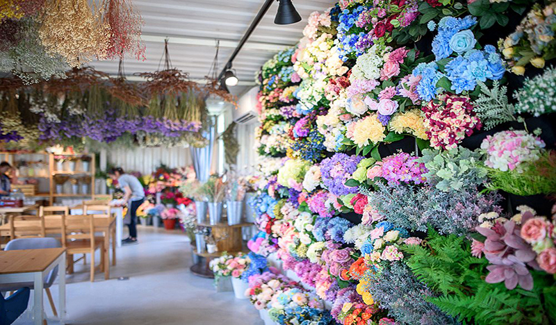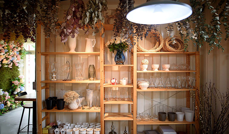 拐過來這個紅色的集裝箱則是作為傳統花店使用,箱內用一整面箱壁來放滿各式各樣在售的花朵和花束,就像突然來到了一面美麗的花墻,繽紛的色彩百花爭艷。一旁還有木架擺放著各種形狀精致并獨特的花瓶,為顧客提供全套產品銷售。