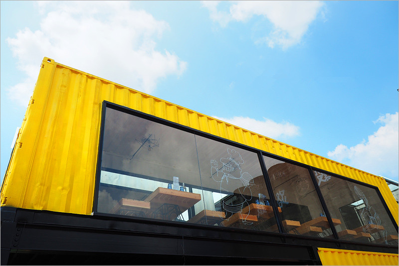 踏進園區,一座明亮耀眼的黃色集裝箱群引入眼簾。集裝箱立面分別被切割或者鑲上玻璃門窗,窗戶上貼上了各式各樣的圖案,這樣一來既保證了建筑內部的通風和透光性,也美化了建筑外觀。