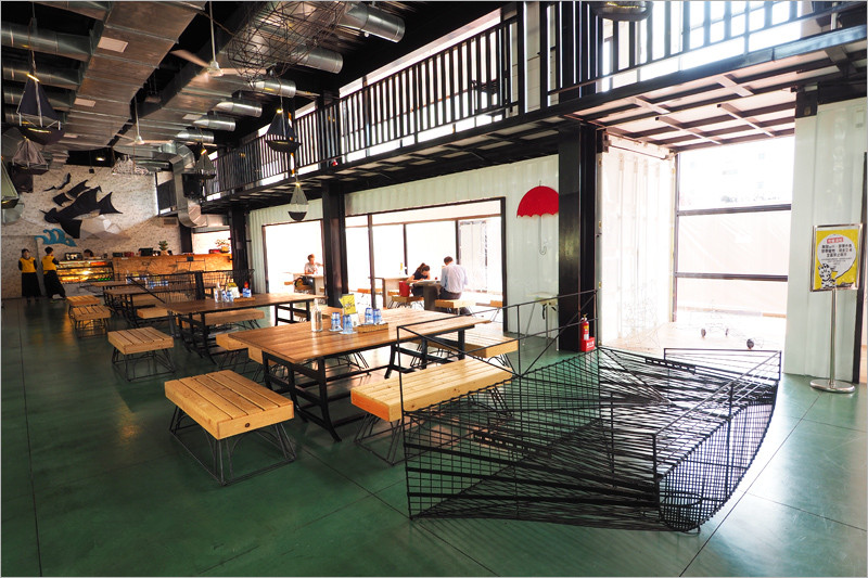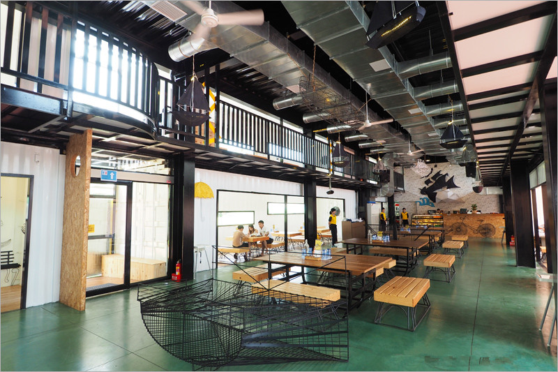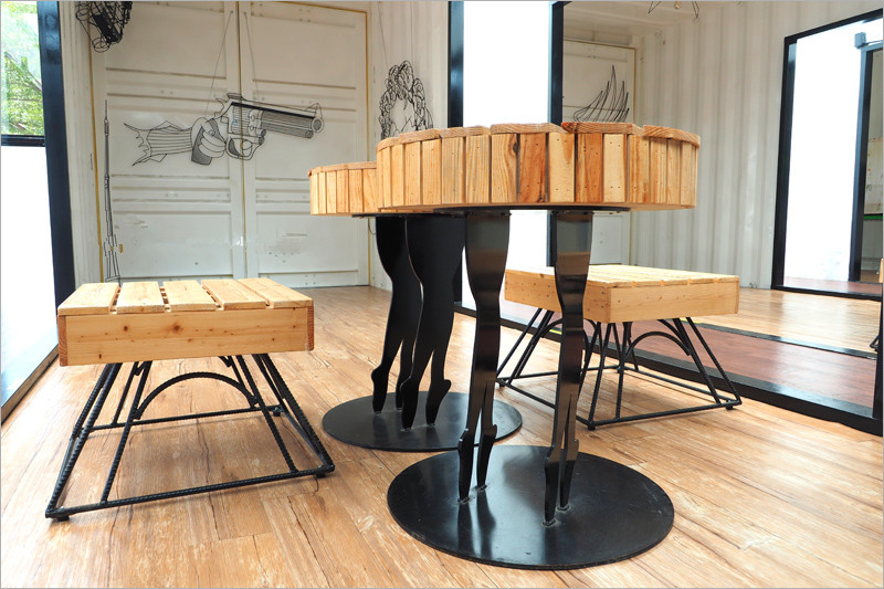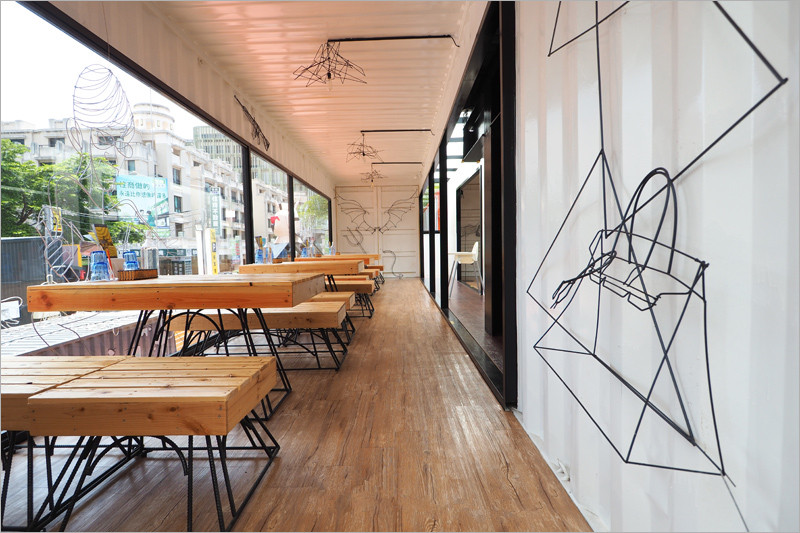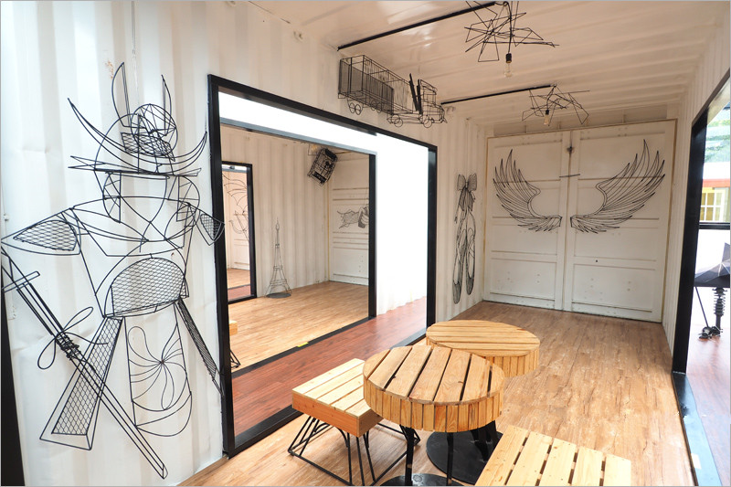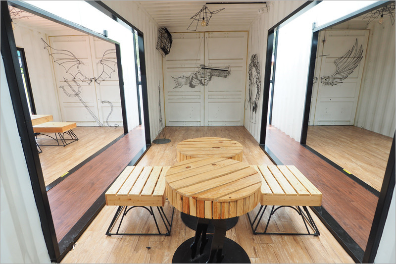 集裝箱內采用了大量的木質材料和家具,家具采用鐵制的各種造型和木板相結合,簡約時尚。建筑內部是一個復合式的餐廳,兩層都可供客人使用,墻面都畫上了Q版的經典人物圖像,游客可以和這些造型各異的圖像拍照留念。除此以外,園區還有特別的鐵絲藝術飾品,鐵絲環繞成不同的物品造型,獨特吸引。