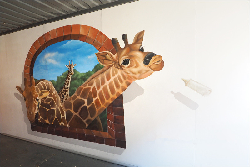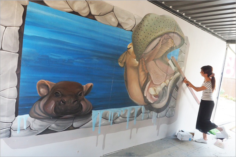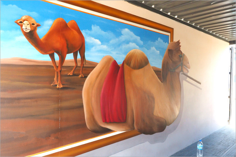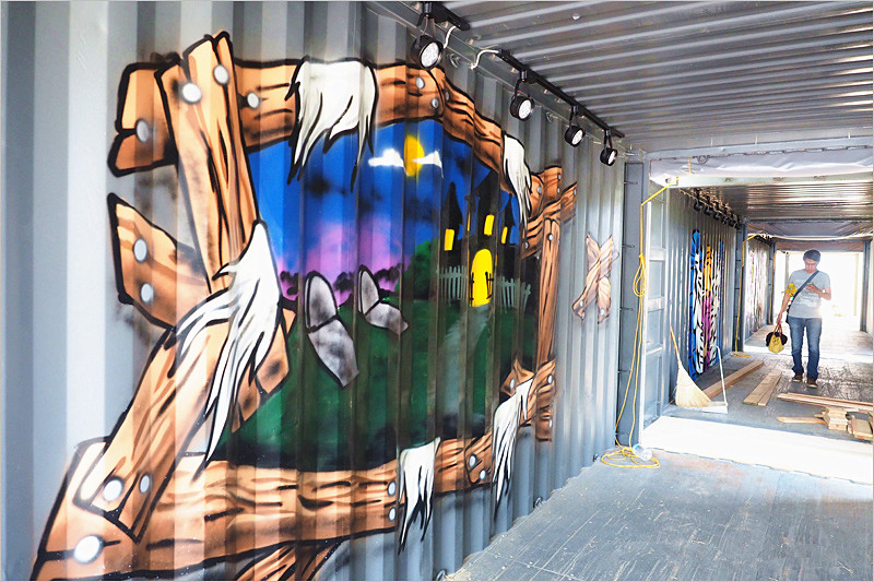整齊的集裝箱環繞著小區,有的集裝箱內部墻面都是3D仿真彩繪,許多游客都忍不住和他們拍照留念,十分有趣;有的是對外開放的小餐廳,內部擺上桌椅等設施,外面的路人也可以在此享用休息。
