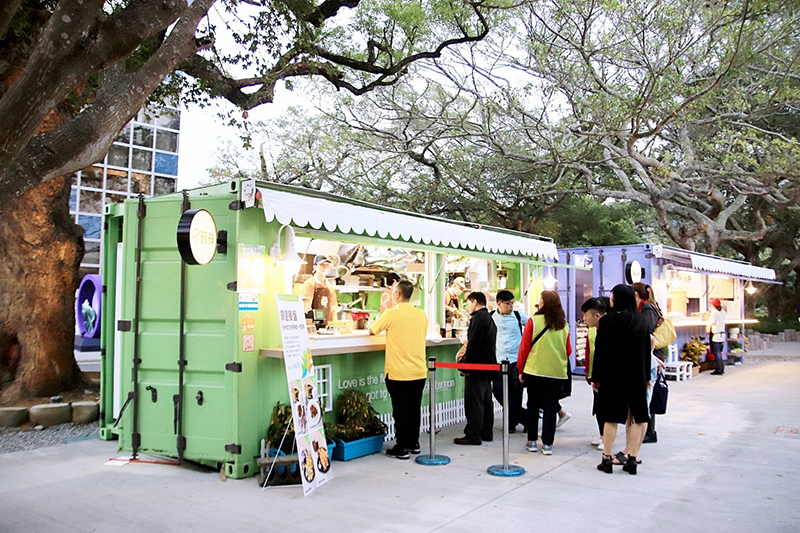 花展的一個服務區,為游客打造了一個集裝修旅客服務中心、售票亭、急救站、志工室、哺集乳室等5種造型各異的機能集裝箱服務區,旨在為游客提供便民服務。