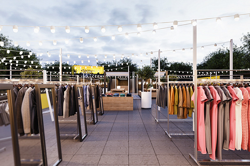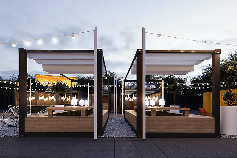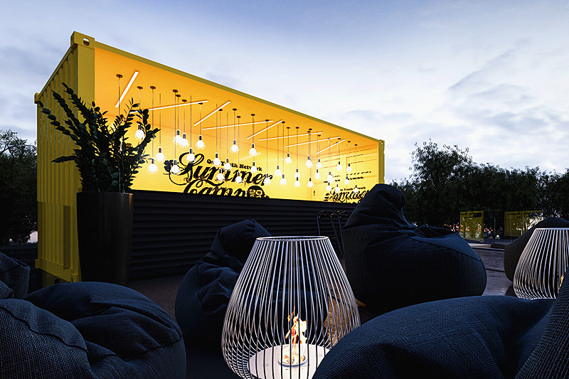 結合當?shù)氐墓诺滹L格,這個融入現(xiàn)代元素的假日集市獨具一格,也得到了人們的欣賞和認可。寬闊的廣場上,正中央高高矗立的黃黑色集裝箱舞臺吸引了路人的眼球,高低有致的布局把廣場劃分為各個功能區(qū)。玻璃圍欄把白色桌椅休閑區(qū)圈起來,人們可以在此享用食物休息觀賞表演等。