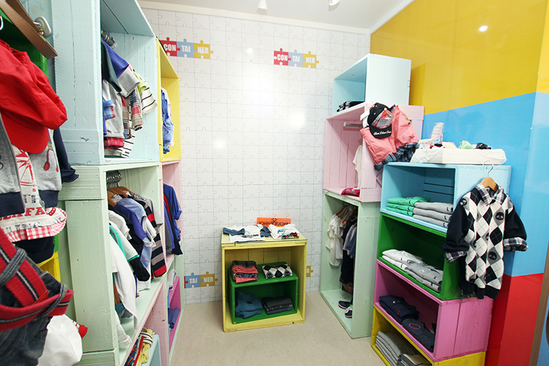 收納箱形狀的衣服展示架,拼圖式樣的背景墻,童趣味十足~!