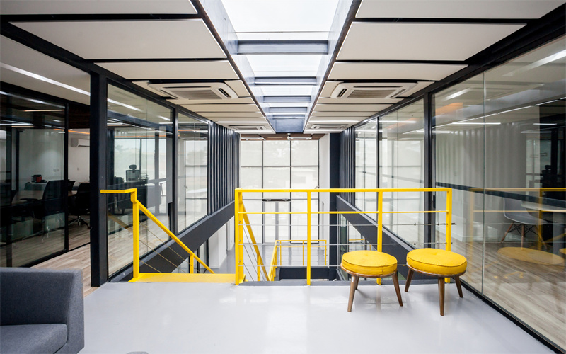 走在辦公樓之間,你會發現室內的光線十分充足,顯得環境明亮寬敞。這得益于在建造的時候把集裝箱的兩端旋轉門替換成落地玻璃,并在最頂層的天花上打造一個天窗。