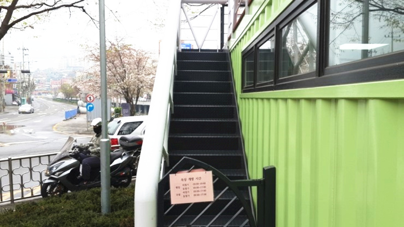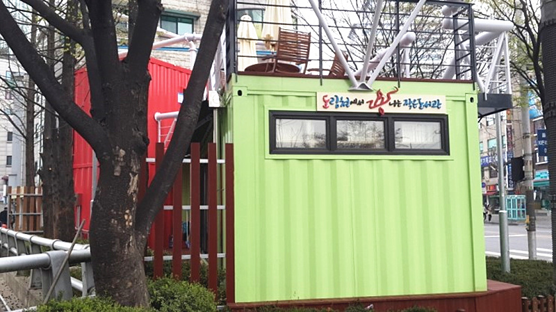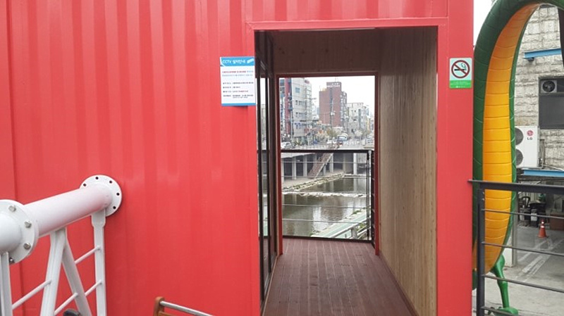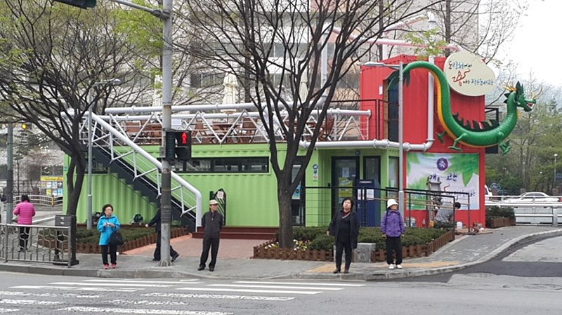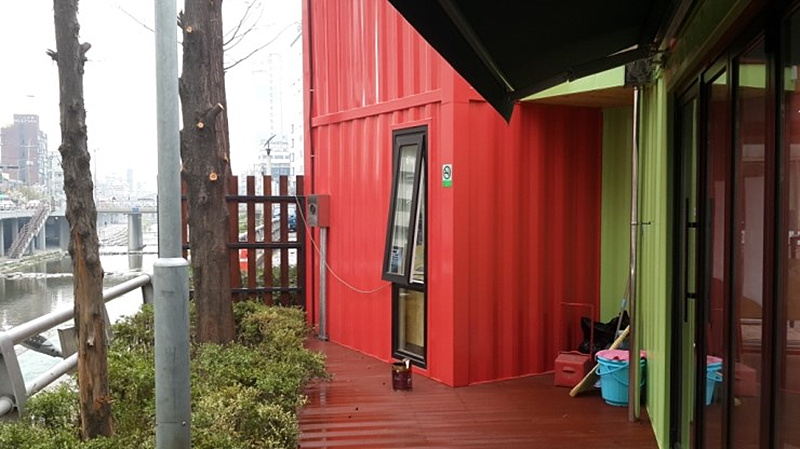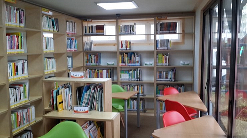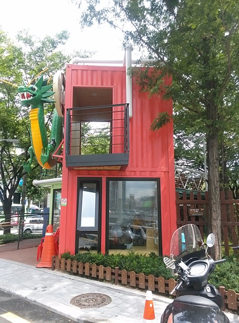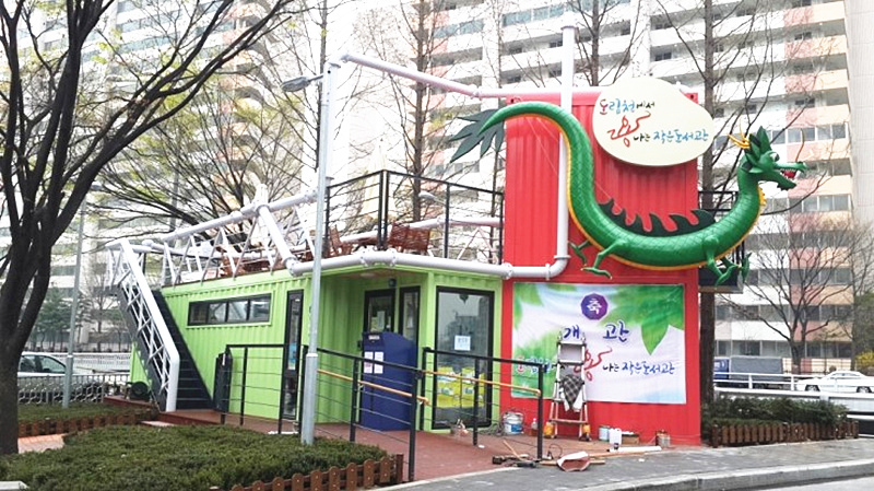 位于韓國的小龍圖書館由三只集裝箱組合而成,綠色集裝箱是由40尺集裝箱組成,是一個借閱圖書的地方;而紅色箱體是由兩只10尺的集裝箱組成,是一個休息室。