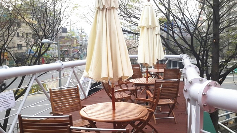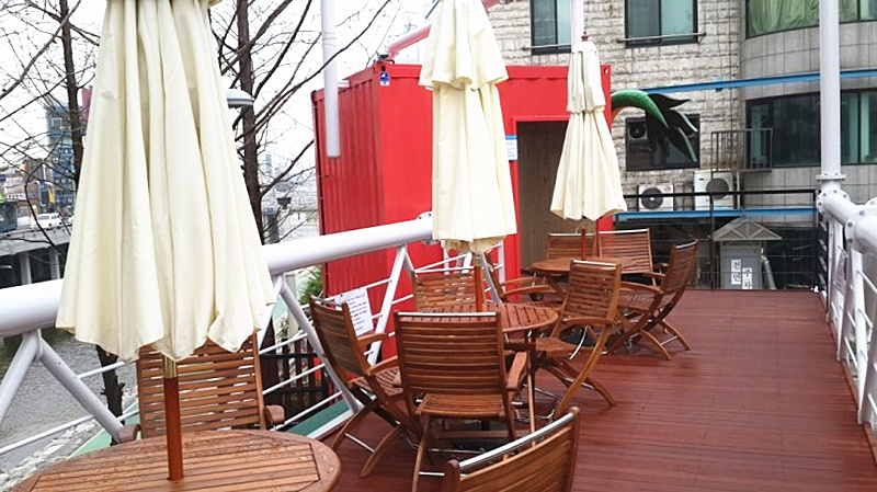 在綠色集裝箱的頂部作了結(jié)構(gòu)加固,并搭建了一個休閑陽臺。棕色的戶外木地板搭配同色系的桌椅,讓人感覺十分親近自然。