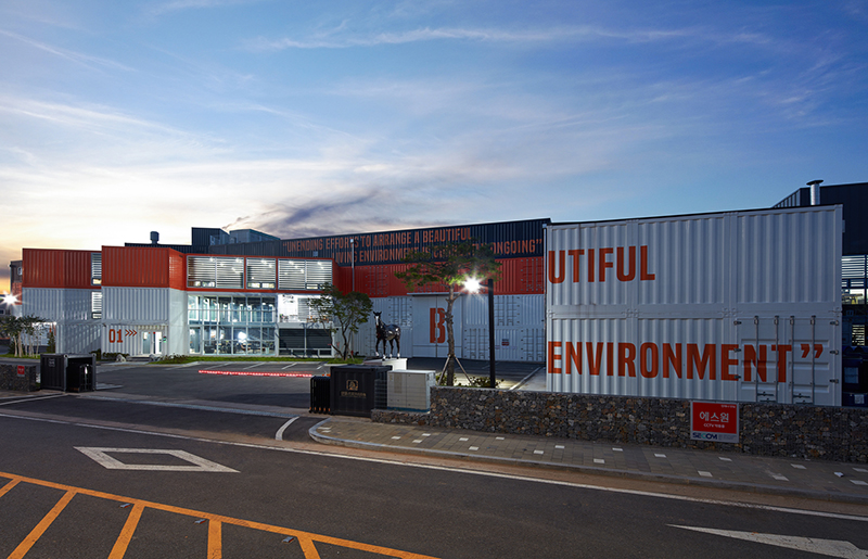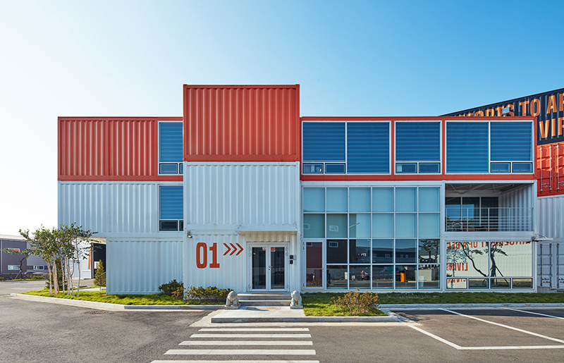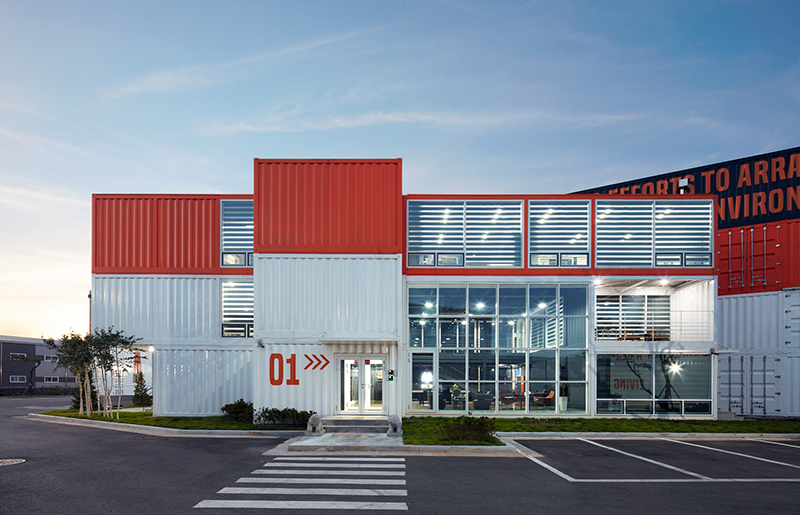 你會發(fā)現(xiàn)這所建筑的材料都是熟悉的金屬質(zhì)感,這是為了要創(chuàng)造一個具有獨特個性的高效建筑空間,其辦公區(qū)域就是用集裝箱建造的。而由于其廠房的規(guī)模龐大,建筑是以鋼架結(jié)構(gòu)為基礎(chǔ),以集裝箱作為建筑外殼的。