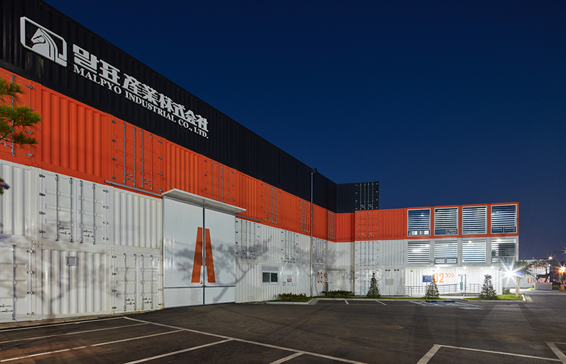 外表涂層的鮮艷橙色和白色使得建筑的標(biāo)識度提高,通過有效地利用集裝箱的結(jié)構(gòu)特色,創(chuàng)造一個象征性的品牌標(biāo)識,來克服工廠作為生產(chǎn)場所的字面概念。你會看到夜晚的廠房搭配上特色的窗戶設(shè)計,就像是從里面透著光的寶藏。