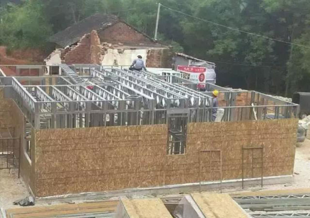人手不多,但地基仍然很快建好,沒有下石腳,只用地腳圈梁。結構架好后,開始上梁,上梁可是大事兒,用的是全輕鋼結構,方便快捷.