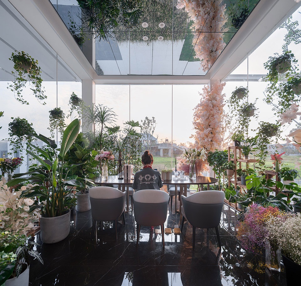 基地內有一棵樹,售樓處采用L形態朝向樹打開,與兩個樣板房體塊圍合出院落,院與樹成為了建筑的視覺中心,整個參觀動線圍繞著院子展開。洽談區作為動線的終點面向大運河展開。洽談區共九個模塊,我們朝向河面方向推出一個模塊,面向運河形成一個凸出的三面臨空的盒子作為茶室。抽離的盒子在洽談區中心留下一個庭院,洽談區圍繞庭院形成內外被自然包裹的流動空間。模型區與洽談區之間增加一個庭院從而保證所有的模塊都能直面景觀,實現內與外的相互滲透。