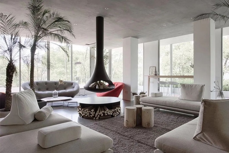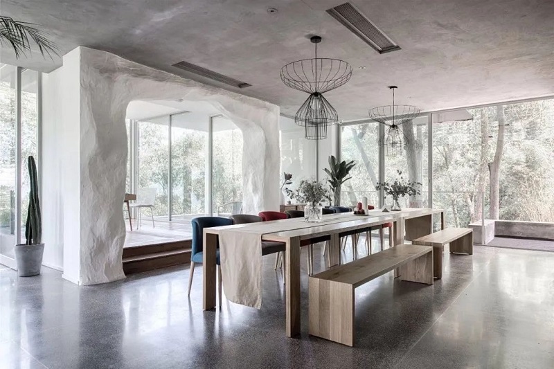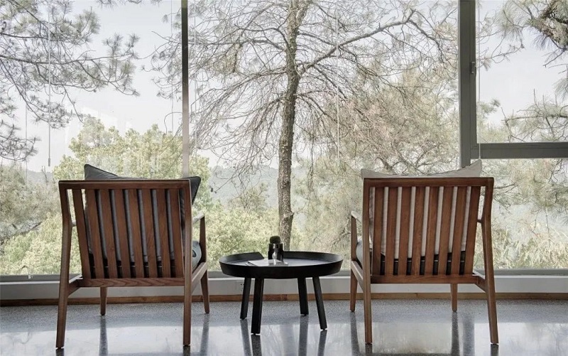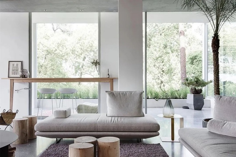大面積的落地窗,可以直接欣賞室外森系“水彩畫”,聽著淅淅瀝瀝的春雨敲打在樹葉上,再前仆后繼的落地,反彈出泥土濕潤的香氣,經由四面八方的開敞著的落地窗侵入屋內,很容易就入了神。這里的每一件家具都價格不菲,純凈天然的空間,每一處都顯得克制且用心,雖簡約卻精致耐看,值得你細細琢磨。